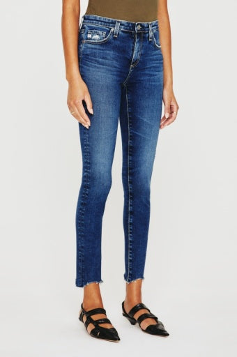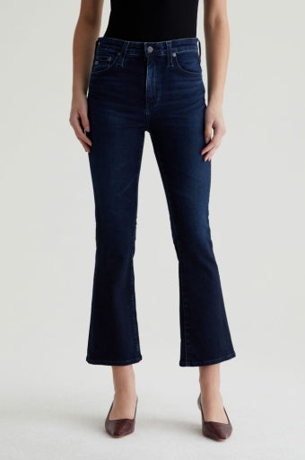 Our Farrah Boot Crop jeans feature a mid-rise bootcut silhouette in 10 oz. superstretch Empower Denim from Japan. The AG-ed™ pair features a dark blue wash worn in by subtle fading and whiskering. These women’s bootcut jeans sit right at the natural waist and has a skinny fit through the legs before opening into a subtle flare.