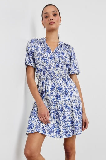 The Fiorella is an airy mini dress crafted from lightweight crinkle chiffon. It features subtle peplum sleeves, a plunging v-neckline, and a shirred waist that flows into a lined, tiered skirt.