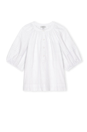 Soft and lightweight in luxe linen, the Shoshanna top features patchwork embroidery, a button front, and raglan sleeves for a relaxed look and easy wearing.