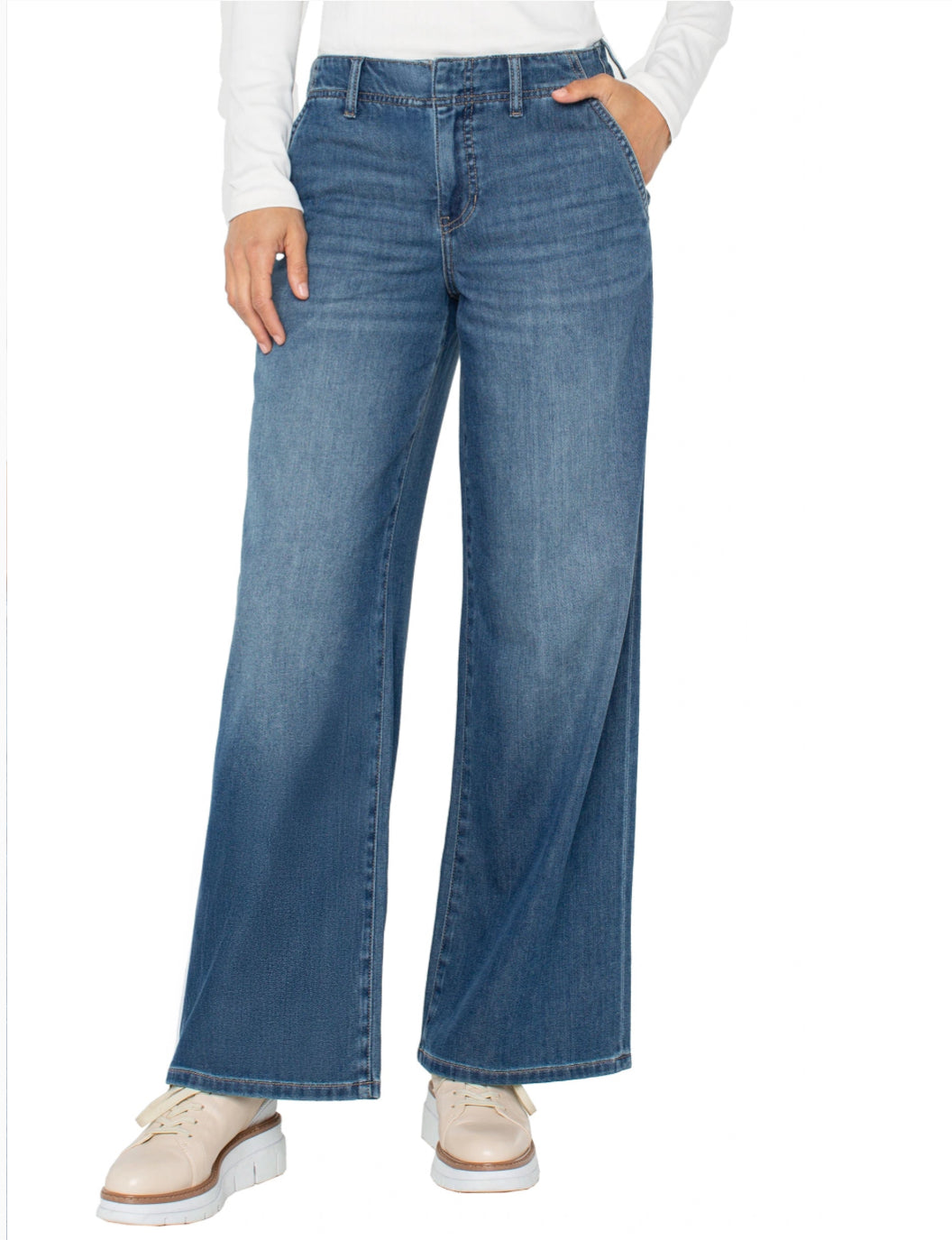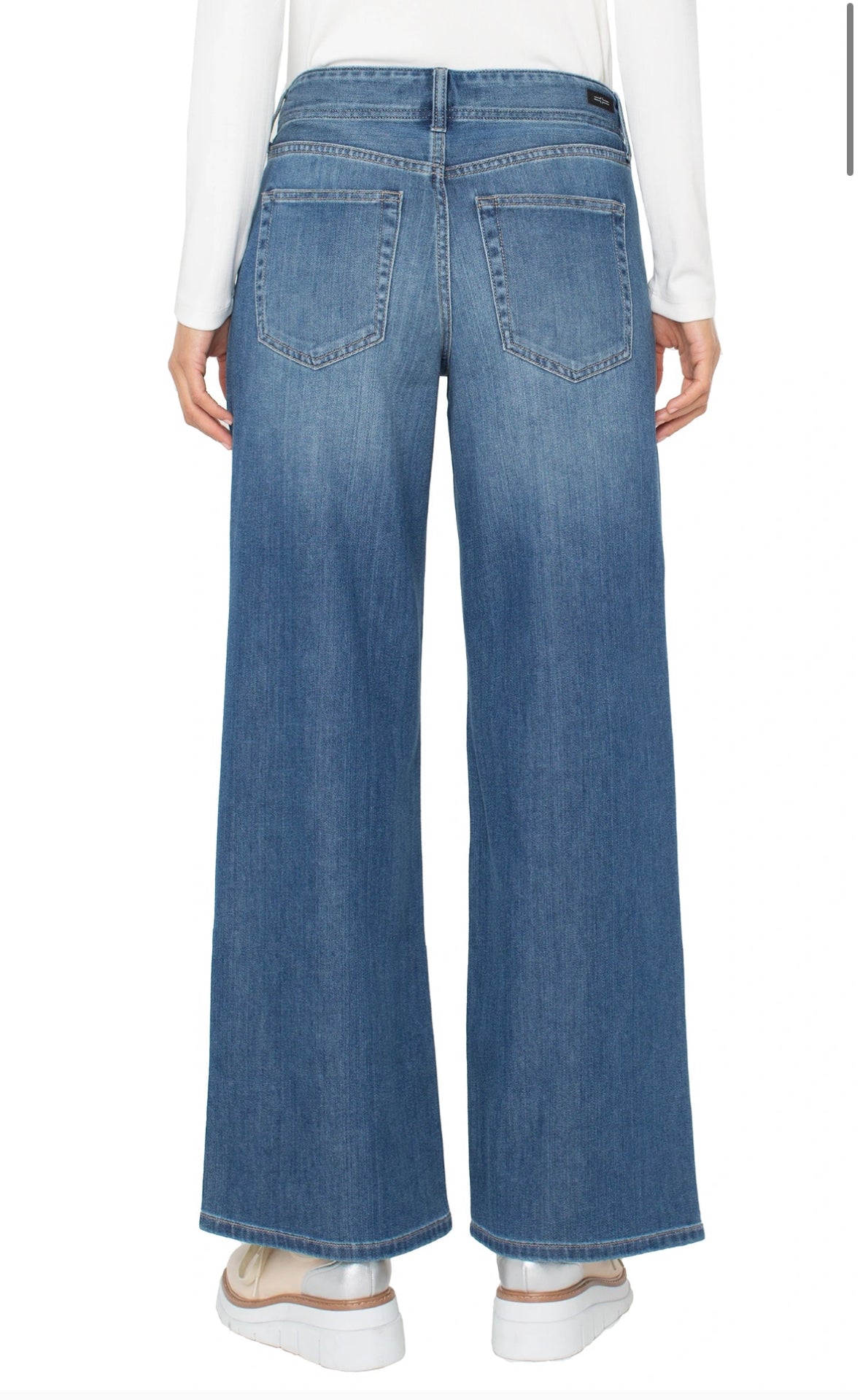 Relaxed yet refined, these wide-leg jeans strike the perfect balance between comfort and sophistication. Crafted from medium-wash stretch denim, the tailored silhouette and wide waistband offer a flattering fit that moves with you—ideal for off-duty days and beyond.